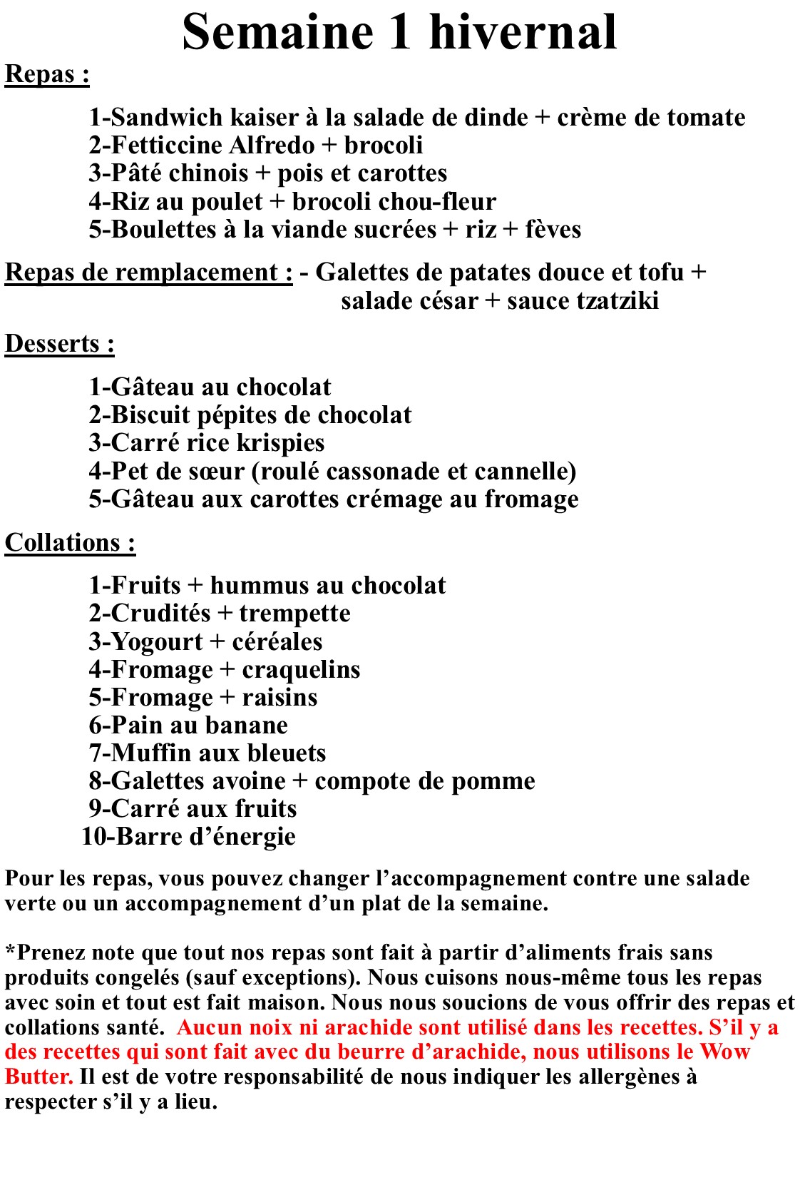Si un repas ne fait pas l'unanimité Les délices de Pa pis Ma vous offre une alternative par semaine. Veuillez vous référer au menu de la semaine pour connaître le plat de remplacement.