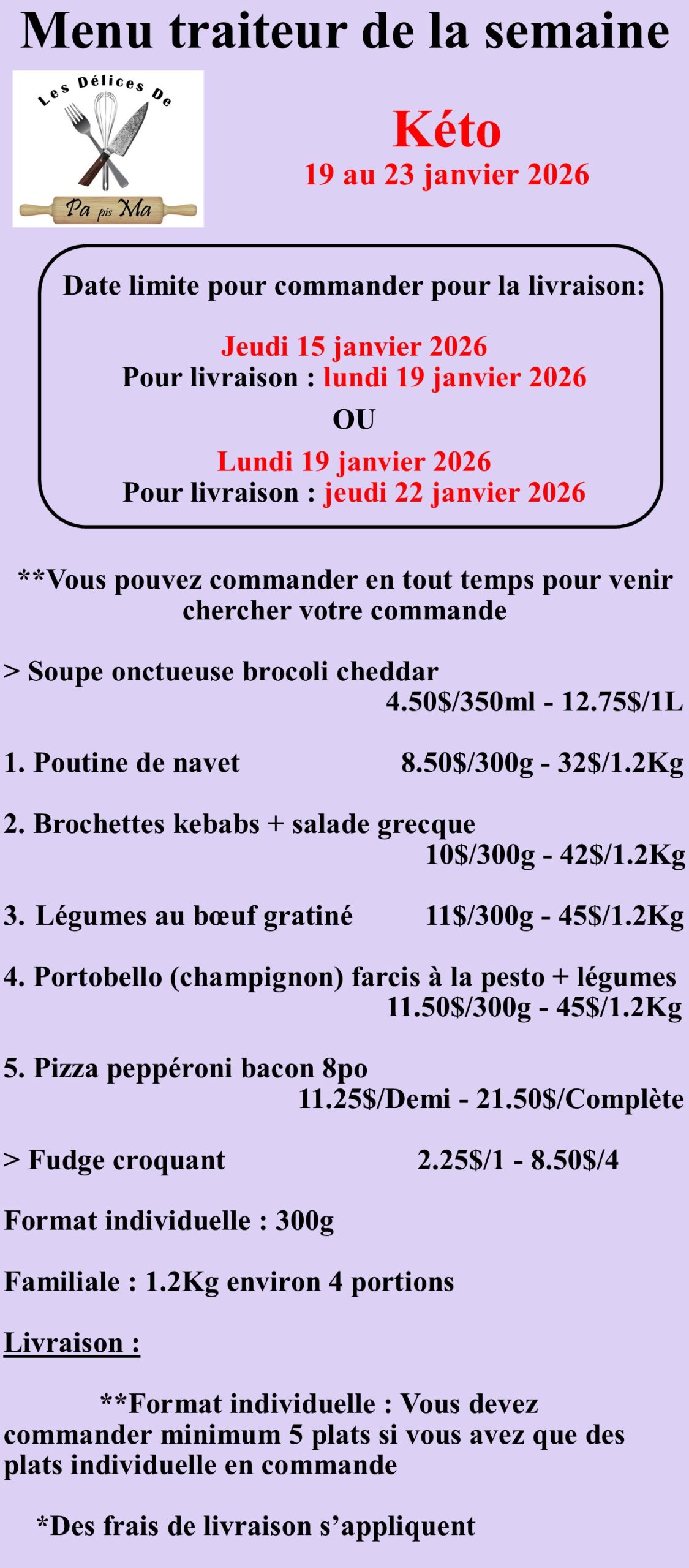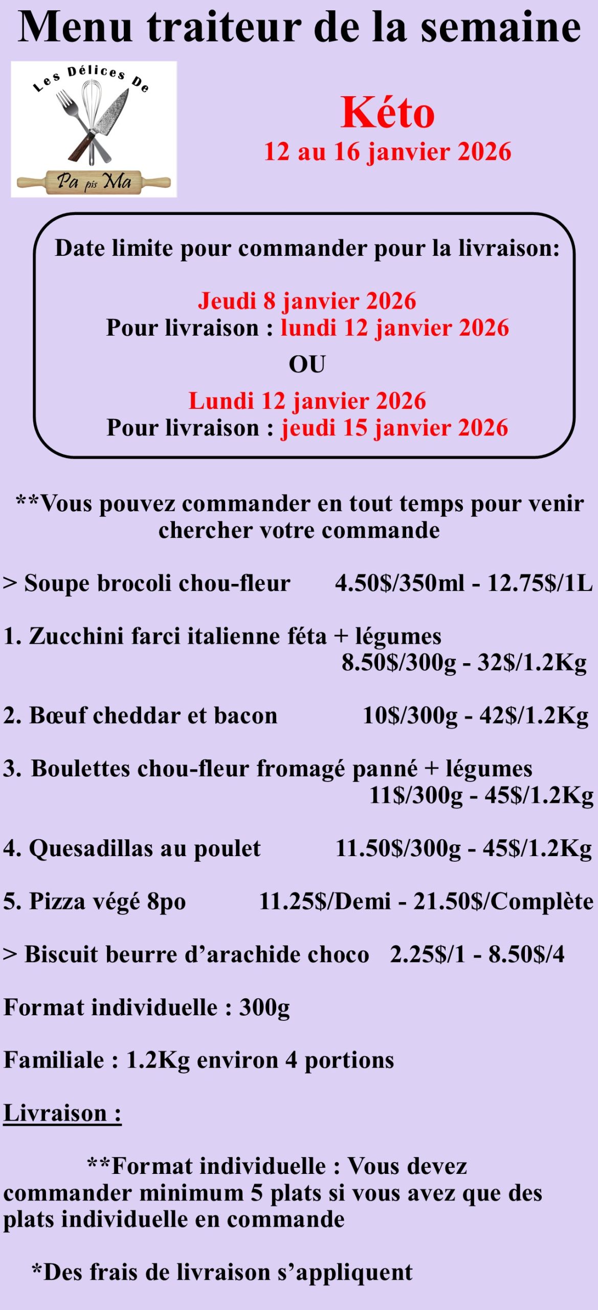 Semaine 1 : 12 au 16 janvier Semaine 2 : 19 au 23 janvier Formulaire de commande Menu de la semaine keto Étape 1 de 3 33% Name(Nécessaire) Prénom Nom Phone(Nécessaire)Email(Nécessaire) Address(Nécessaire) Adresse postale Adresse ligne 2 Ville État / Province / Région ZIP / Code postal AfghanistanAfrique du SudAlbanieAlgérieAllemagneAndorreAngolaAnguillaAntarctiqueAntigua-et-BarbudaArabie SaouditeArgentineArménieArubaAustralieAutricheAzerbaïdjanBahamasBahreïnBangladeshBelarusBelgiqueBelizeBermudesBhoutanBolivieBonaire, Saint-Eustache et SabaBosnie-HerzégovineBotswanaBrunei DarussalamBrésilBulgarieBurkina FasoBurundiBéninCambodgeCamerounCanadaCap-VertChiliChineChypreColombieComoresCongoCosta RicaCroatieCubaCuraçaoCzechiaCôte d’IvoireDanemarkDjiboutiDominiqueEspagneEstonieEswatiniFidjiFinlandeFranceGabonGambieGhanaGibraltarGrenadeGroenlandGrèceGuadeloupeGuamGuatemalaGuerneseyGuinéeGuinée FrançaiseGuinée équatorialeGuinée-BissauGuyaneGéorgieHaïtiHeard Island and McDonald IslandsHondurasHong KongHongrieIles AlandIndeIndonésieIrakIranIrlandeIslandeIsraëlItalieJamaïqueJaponJerseyJordanieKazakhstanKenyaKirghizistanKiribatiKorea, Democratic People's Republic ofKorea, Republic ofKoweïtLa BarbadeLa RéunionLesothoLettonieLibanLiberiaLibyeLiechtensteinLituanieLuxembourgMacaoMadagascarMalaisieMalawiMaldivesMaliMalteMarocMartiniqueMauritanieMayotteMexiqueMicronésieMoldavieMonacoMongolieMontserratMonténégroMozambiqueMyanmarNamibieNauruNicaraguaNigerNigériaNiueNorth MacedoniaNorvègeNouvelle CalédonieNouvelle-ZélandeNépalOmanOugandaOuzbékistanPakistanPalauPanamaPapouasie-Nouvelle-GuinéeParaguayPays-BasPhilippinesPitcairnPolognePolynésie françaisePorto RicoPortugalPérouQatarRoumanieRoyaume-UniRussian FederationRwandaRépublique DominicaineRépublique centrafricaineRépublique démocratique du CongoRépublique démocratique populaire LaoSahara occidentalSaint BarthélemySaint Helena, Ascension and Tristan da CunhaSaint MartinSaint-Christophe-et-NevisSaint-MarinSaint-MartinSaint-Pierre-et-MiquelonSaint-SiègeSaint-Vincent-et-les GrenadinesSainte-LucieSalvadorSamoaSamoa américainesSao Tomé et PrincipeSerbieSeychellesSierra LeoneSingapourSlovaquieSlovénieSomalieSoudanSoudan du SudSouth Georgia and the South Sandwich IslandsSri LankaSuisseSurinameSuèdeSvalbard and Jan MayenSyria Arab RepublicSénégalTadjikistanTanzania, the United Republic ofTaïwanTchadTerres australes FrançaisesTerritoire britannique de l'océan IndienThaïlandeTimor-LesteTogoTokelauTongaTrinité et TobagoTunisieTurkménistanTuvaluTürkiyeUkraineUruguayVanuatuVenezuelaViet NamWallis et FutunaYémenZambieZimbabweÉgypteÉmirats arabes unisÉquateurÉrythréeÉtat palestinienÉtats-UnisÉthiopieÎle BouvetÎle MauriceÎle de ManÎle de NorfolkÎle de NoëlÎles CaymanÎles CocosÎles CookÎles FalklandÎles FéroéÎles Mariannes du NordÎles MarshallÎles SalomonÎles Turques-et-CaïquesÎles Vierges américainesÎles Vierges britanniquesÎles mineures éloignées des États-Unis Pays Pour quelle semaine?(Nécessaire) Semaine 1 Semaine 2 Soupe et crèmeNombre de portions 350mL Soupe Quantité Prix: $ 4.50 CAD Quantité Nombre de portions 1L Soupe Quantité Prix: $ 12.75 CAD Quantité Total RepasNombre de portions 300g Repas 1 Quantité Prix: $ 8.50 CAD Quantité Nombre de portions 1,2Kg Repas 1 Quantité Prix: $ 32.00 CAD Quantité Nombre de portions 300g Repas 2 Quantité Prix: $ 10.00 CAD Quantité Nombre de portions 1,2Kg Repas 2 Quantité Prix: $ 42.00 CAD Quantité Nombre de portions 300g Repas 3 Quantité Prix: $ 11.00 CAD Quantité Nombre de portions 1,2Kg Repas 3 Quantité Prix: $ 45.00 CAD Quantité Nombre de portions 300g Repas 4 Quantité Prix: $ 11.50 CAD Quantité Nombre de portions 1,2Kg Repas 4 Quantité Prix: $ 45.00 CAD Quantité Nombre de portions Pizza demie 8po Quantité Prix: $ 11.25 CAD Quantité Nombre de portions Pizza entière 8po Quantité Prix: $ 21.50 CAD Quantité Total DessertsNombre de portions individuelles Dessert 2 Quantité Prix: $ 2.25 CAD Quantité Nombre de portions grosses Dessert 2 Quantité Prix: $ 8.50 CAD Quantité Total Veuillez écrire ici pour les options Sans Gluten/Allergies ainsi que tout autres informations. Prévoir des frais supplémentaires si nous devons changer les ingrédients pour les allergènes. Total Laisser 3 jours de délais pour le ramassage en magasinLivraison(Nécessaire) Je veux faire livrer Je veux ramasser en magasin Jour de Livraison(Nécessaire) Lundi Jeudi Disponibilité(Nécessaire) AM PM AM et PM Entrer les heures disponibles(Nécessaire)Entrer la journée et l'heure de passage(Nécessaire)Payer(Nécessaire) Par carte En magasin Coupon Frais de livraison (taxes incluses)(Nécessaire) Rayon de 10km - 6$ Rayon de 20km - 12$ Rayon de 30km - 18$ Rayon de 40km - 24$ Plus de 40km - 27$ Indiquez à quelle distance de Magog vous vous situez.Credit Card Sans titre Δ